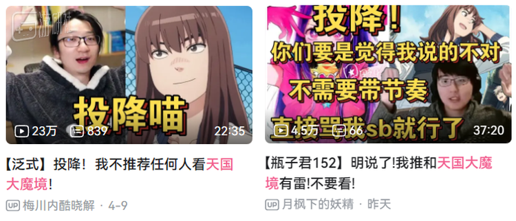 《天国大魔境》正是如此,在大量路人观众靠着泛式这类动漫UP主推出的新番咨询导视选择动画的情况之下,泛式的人气逐渐开始“反噬”,未能在推荐语中点明争议情节的失职,让观众们将矛头对准了这位UP主。