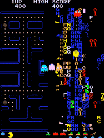 Kill Screen里最出名的关卡画面,当属《吃豆人》(Pac-Man)了,它的毛病同样是因为8bit变量计数,只是它不像《大金刚》那样复杂。