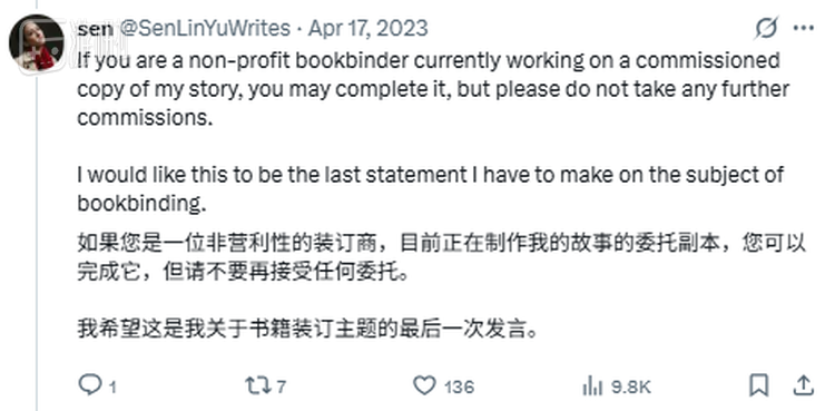 2023年,一场慈善拍卖会在缺乏沟通的前提下用《镣铐之下》的装订版筹集了巨额善款,SenseLinYu因此决定不再接受任何形式的装订委托,但类似现象仍没有止住。