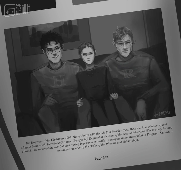 这部同人小说没有简单地以CP二人幸终的情节来结尾,而是跳到了未来的场景:某人正在阅读一本历史书。其中,历史用一个章节记住了马尔福,赫敏却只出现在了一张合照、一段图注里:她是麻瓜,哈利·波特的朋友,凤凰社的非活跃成员,没有参与战斗。