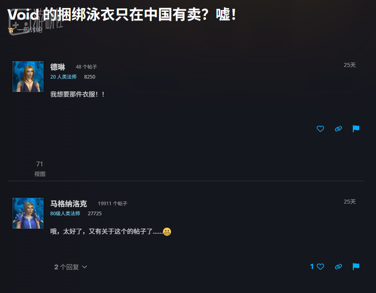 比如不久之前,《魔兽世界》国服就推出了独家的“虚空之缚泳装”,让不少外服玩家一度破防。在各大论坛内,不少玩家纷纷发帖,请求官方将这个国服外观“移植”到其他服务器中,这些帖子下面往往还会有人杀人诛心地回上一句“再跟你提一嘴,他们还有飞行幽灵虎”。