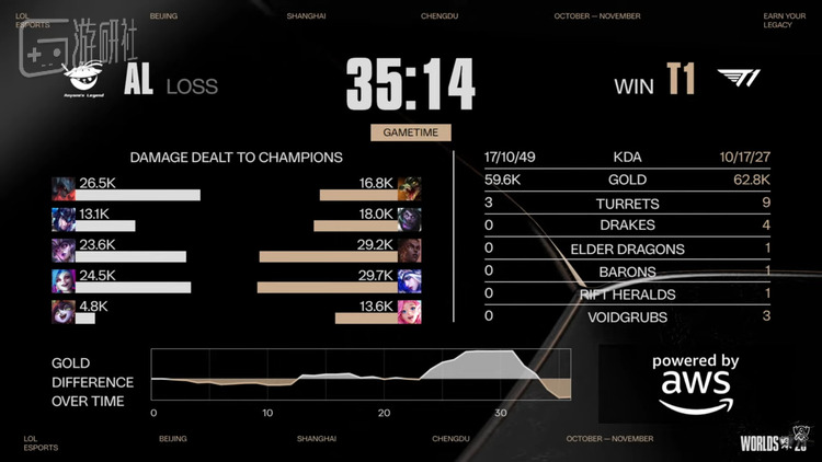 2025《英雄联盟》全球总决赛四分之一决赛,卫冕冠军T1在一场历时近五小时的拉锯大战中,以3:2艰难击败来自LPL的Anyone’s Legend(AL),惊险晋级四强。五局鏖战,节奏反复,双方多次在团战与资源争夺中上演极限操作——这场系列赛不仅延续了中韩巅峰对抗的高水准,也成为本届赛事迄今为止最具戏剧性的对局之一。