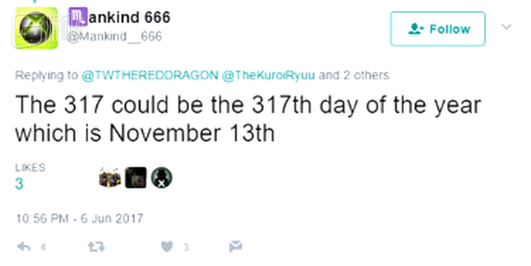 后面数字的部分,一般都会跟日期联系到一起。把“101317”合在一起,就是17年10月13日的意思,有一部分言论认为这是暗示“天蝎”的发售日。