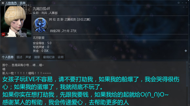 看完ID和信息,不了解的人会以为他是一名女性玩家,在EVE这款硬核太空背景的网游中,女性玩家属于稀缺资源。