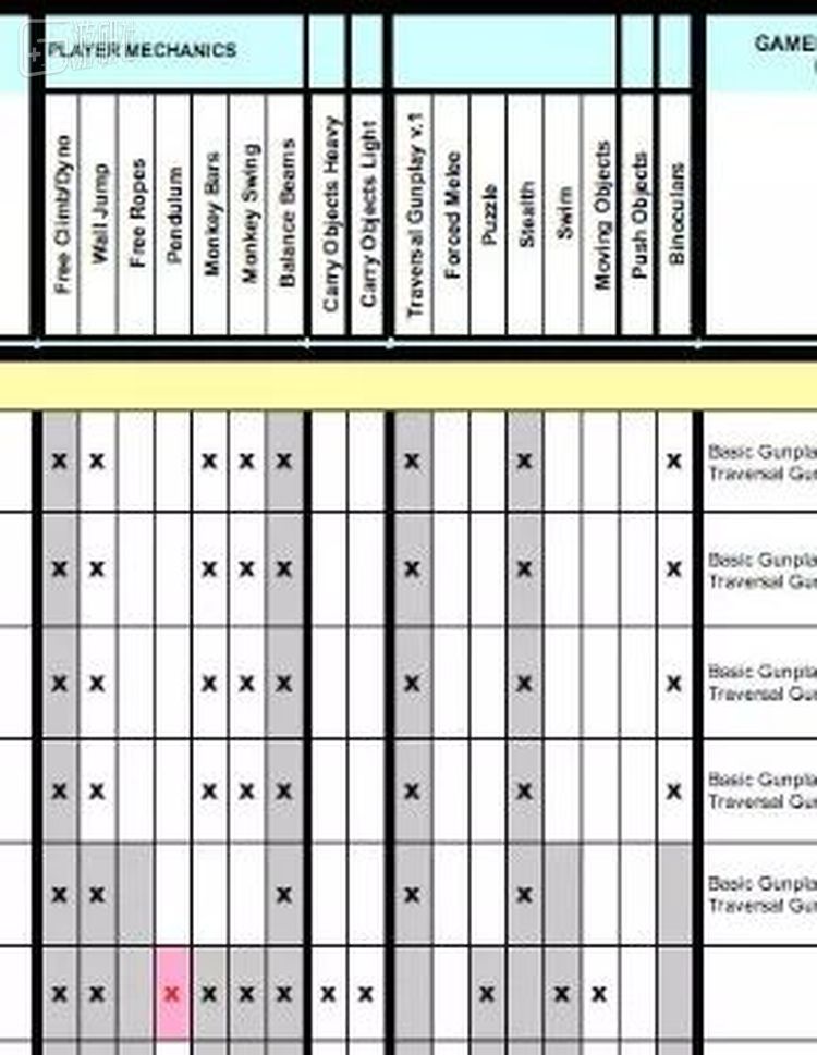 网上流传的《神秘海域2》关卡设计图,可以看到每一章有多少攀爬,射击元素都是有一定比例的