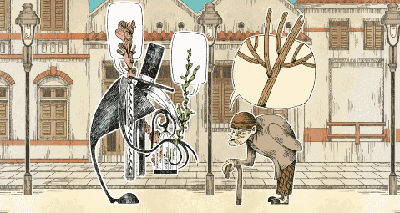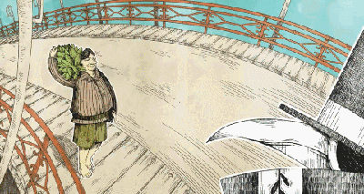 他在桥上遇到了一位农夫,扛着一棵翠绿的灌木。农夫将灌木的绿叶送给了乌鸦先生。街景中出现了绿色的树冠。