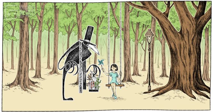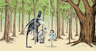 故事开始呈现回文般的展开。乌鸦先生手上的风筝不见了,秋千上的少女也已变成灰色的石块。