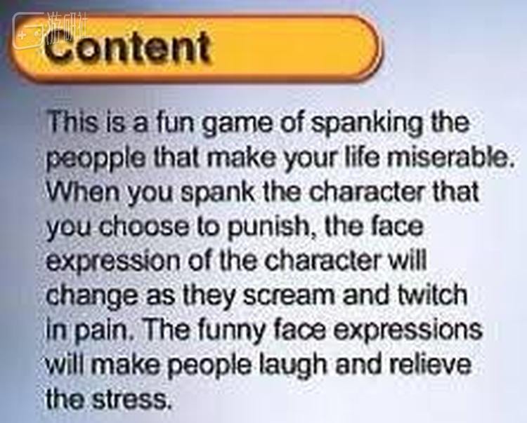 此游戏是给那些经常受人气,迫切需要发泄的人准备的体感型街机。选一个你讨厌的对象,然后用力扇屁股来惩罚他(她),该对象会发出痛苦的尖叫,摆出扭曲的面孔,那副嘴脸定可让玩者缓解怨气,开心大笑。