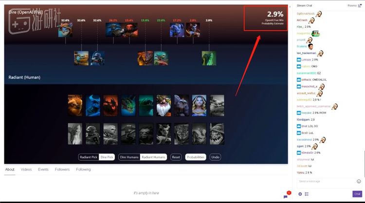 最后或许是面子上实在过不去了,官方临时决定修改规则——最后一局由观众给AI选择英雄。于是经过一波瞎比操作过后,AI拿到了一套四近战的短手脆皮阵容,根据它自身计算评估,给出的胜率仅仅只有可怜的2.9%。