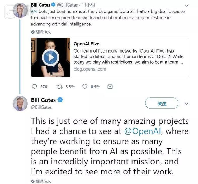 伴随着种种疑问与遐想,OpenAI研发团队进入了低调而沉默的研发状态,除了保持在自家博客上更新一些训练细节以外,他们几乎很少在公众视野中露面。直到今年6月25日,OpenAI在Twitter上发布了一小段视频,声称所开发的5V5机器人已经成功击败4000分左右的玩家,并且得到了比尔·盖茨的转发与盛赞。