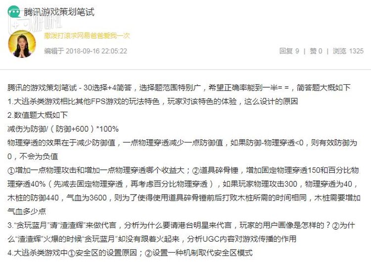 需要提醒的是,这只是网友所记下的数值试题,并不代表完整的游戏策划题目。因此不能像某些网友评论的那样,凭此就判断网易想要先筛除追求游戏好玩的应聘者。