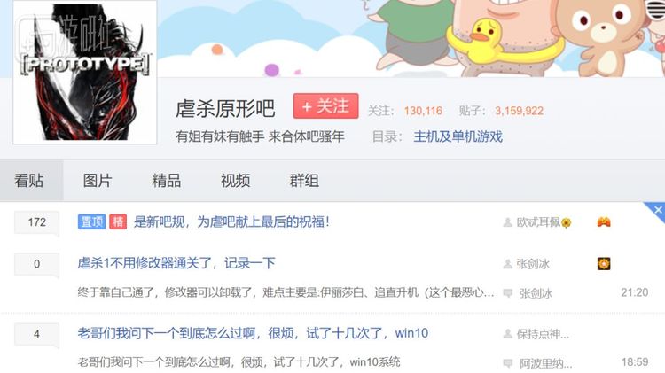也有不少人发帖是为了问游戏不能运行、报错的原因。而游戏出错的原因里,最常见的是系统不兼容——《虐杀原形》是10年前的游戏,人们下载的版本与现在的Win10系统相处不来。吧务团队很敬业,据小吧主“恶魔猎手一世”说,每天他都要解决好几个迷途网友的问题。