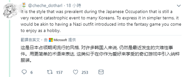 于是,在Mina转推的这套国服专属服饰下面,有大量韩国玩家开始给大家解释“这套衣服对于我们来说相当于纳粹军服”: