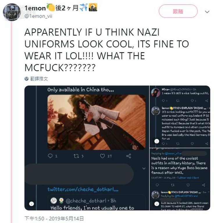 SE官方目前没有对此事作出回应。但就在这篇文章快写完的时候,最早把国服这套衣服发到推特上的Mina突然删除了原始推文,只留下韩国玩家们长长的讨论串。“自尊”和“敏感”的界限,还真是很难找到。