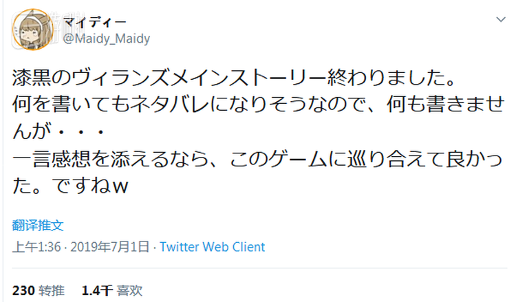“《漆黑的反逆者》的主线故事完成了。因为写什么都会剧透所以还是不写了。如果一定要写点什么感想的话,能遇到这个游戏真是太好了。(笑)”