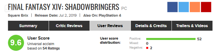 随着5.0资料篇《漆黑的反逆者》于7月2日在国际服正式上线,玩家们给予这款网络游戏的评价进一步提高,有玩家将之称为“不逊色于FF单机作品的网络游戏”或者“最好的《最终幻想》故事之一”。
