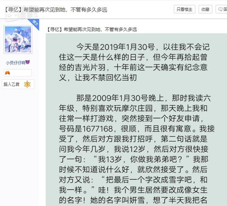 我和一个曾经发帖寻小时女玩伴的玩家聊过他寻找对方的含义和目的,他也同样解释不清,他说即使找到,八成对方也有了孩子,也没什么意义。我后来告诉他,我可以帮他转发或发文,但这位玩家还是显得有点不好意思:“这不重要,就是一个游戏而已”,同时他也觉得:“应该是找不到了”。
