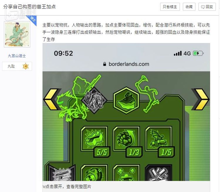 在研究加点的过程中,我惊讶地发现,虽然游戏还没上,贴吧玩家就已经基于官方加点模拟器,开始分享自己的构思。其中思路,有的存在实用价值,有的实际没有效果,但我觉得这都很好,这就是《无主之地》的魅力。