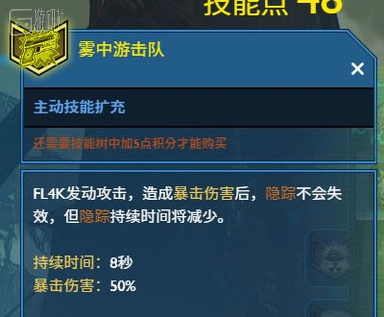 但实际情况是,一旦给主动技能插上第一个扩充“雾中游击队”,隐身就不会因射击失效,只是减少持续时间。这意味着,隐身状态下的暴击不止3发,只要你找到一把射速够快的枪,发动一次主动技能,就可以打出连续30发、60发暴击。