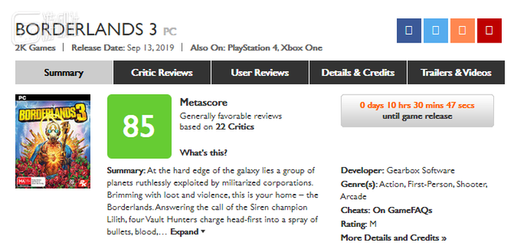 到本文截稿的时候,基于22篇外媒评测,《无主之地3》的Metacritic均分是85分。在2019年推出的游戏里,这是一个高分,但不是一个顶尖的分数。