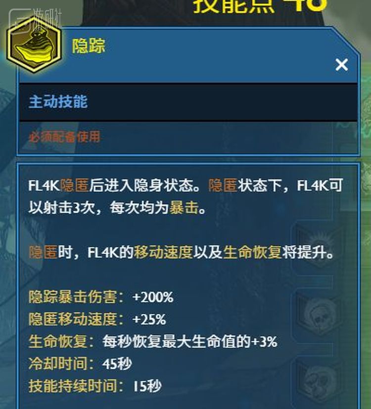 但实际玩起来与这种解读区别很大。我最初一直在点追求攻击与暴击的猎人线,在遇见第一个连续2次都没打过Boss之后,不得不试试切换潜行者线。从名字看,这条线侧重隐蔽,主动技能确实可以隐身,隐身状态下可以射出3次暴击,听起来像是狙击手。
