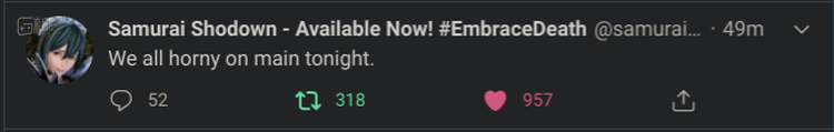 但不知怎么回事,SNK的官推就把玩家随口的一句恭维当了真,不仅转发了这条“感谢”推特,还呼吁:“今夜让我们一起Horny On Main”。