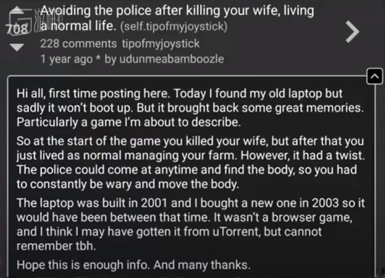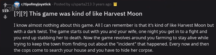 帖子里他描述自己曾经在电脑里下载过这个类似《星露谷物语》的邪恶种田游戏,玩家需要杀掉妻子,通过若无其事地种田来掩盖真相。除了一些细节上的出入,基本与当年Sparta所描述的内容吻合。
