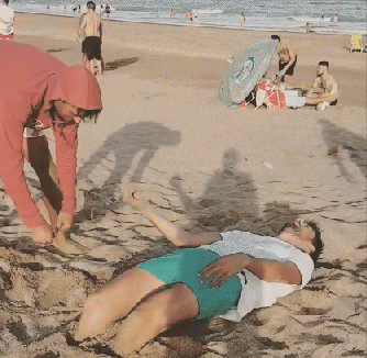 腰身力量不够,那就在海滩上来一场完美复刻,沙滩上经常会看到模仿充气人偶的新玩法。