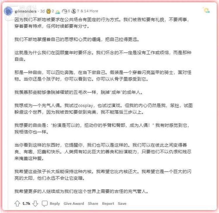 Atillion在Reddit的帖子里如此写道。让他万万没想到的是,这个温暖了他和儿子的画面,还把温度传递给了数十万网友。他关于“传奇充气人偶”的视频在发出后点赞数直线飙升,仅用7个小时就登顶了Reddit当日的热度榜,3天后以17.3万赞跻身到了年度热门主题中。