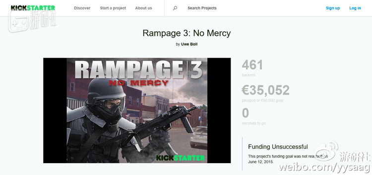 乌维·鲍尔在视频当中说:“这是劳资最后一次搞这种事,之前《传送门2》失败了,《狂暴3》在indiegogo(全球第二大众筹平台)失败了,现在它在Kickstarter又失败了。总之劳资想说的就是只有他X的智障才会在这种网站上投钱。有上千人联系劳资,说‘我可以帮你推广你的项目,不过你筹得的资金的10%必须分给我’。艹X妈的傻伯夷,劳资的钱够天天打高尔夫球的了。对劳资来说众筹已死,其实劳资自己完全可以自掏腰包拍摄《狂暴3》,但既然大家都对这电影不感兴趣,那就去看好莱坞拍的那些傻X的巫师和英雄吧!”