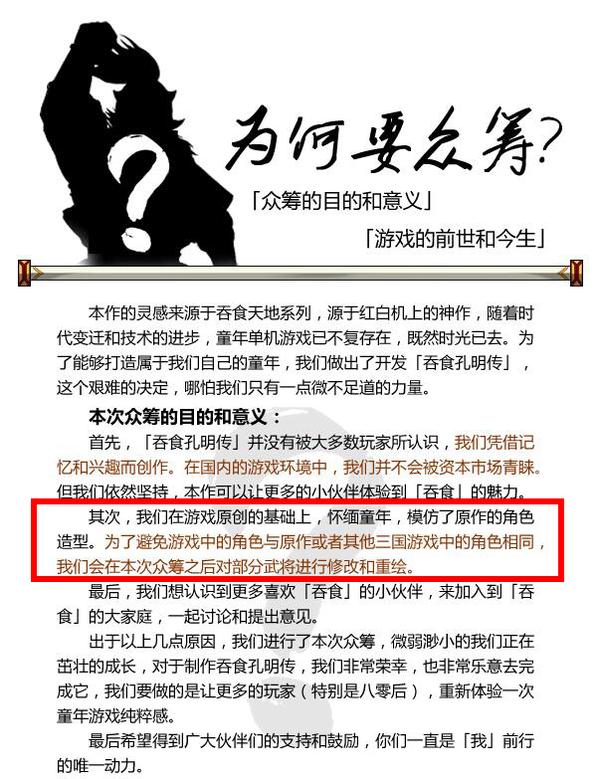 不过其实在游戏众筹页面上,作者倒是半官方地承认了的事实:“为避免游戏中的角色与原作或其他三国游戏中的角色相同,我们会在本次众筹之后对部分武将进行修改和重绘。”