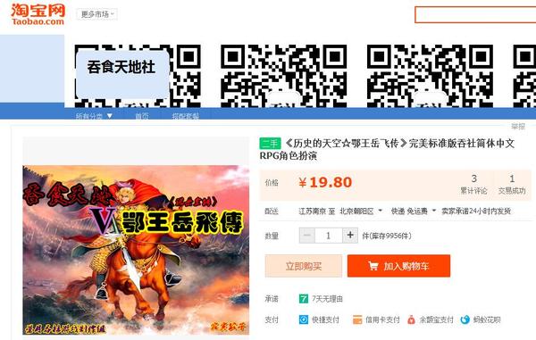 除了这些在论坛上发布作品之外,也有的同人作者选择了自己在淘宝闷声发财,依靠“口碑”传播。比如淘宝店“吞食乱世”,商品之一的《吞食天地2重制豪华威力加强最终版》,卖了快300份。游戏一度被3DM破解,却反而增加了知名度和销量。