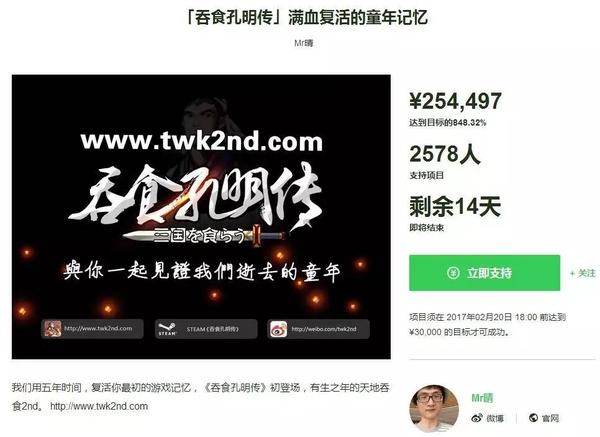 春节前,一个名为《吞食孔明传》的游戏出现在众筹社区“摩点网”。项目发起者“Mr晴”重制了Capcom于1991年发售的FC游戏《吞食天地2:诸葛孔明传》,预计登陆PC平台,并出现在Steam的青睐之光中。