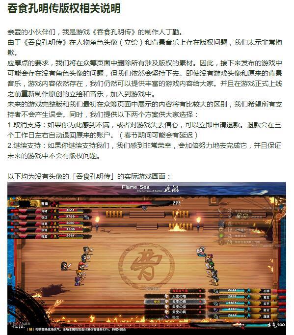 随着关注人数的上升,围绕《吞食孔明传》素材侵权的质疑越来越烈,在摩点、微博和知乎都引起了不少讨论。之后该游戏在Steam绿光下架,众筹平台也与开发者进行了交涉。