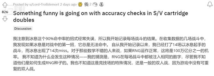 11月27日,海外一位宝可梦玩家发帖表示自己察觉到了玩家对战中存在的伪随机问题。起初他发现自己的精灵“雪妖女”先手释放技能“冰息”时的命中率低的离谱,在总计14次的测试之后这位玩家基本确信,这个命中率90%的技能在先手第一招使用时是不可能命中的,毕竟出现这类情况的概率只有100万亿分之一。