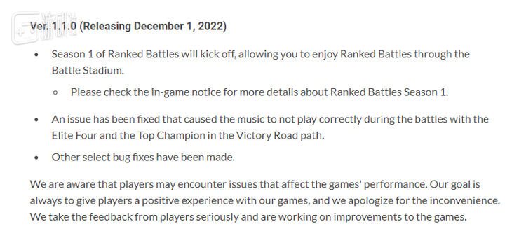 任天堂官网今天公布,他们将立即发布1.1.0版本补丁对游戏进行更新。根据公告直接透露的信息,游戏确定修复了部分选择错误,以及冠军之路战斗音乐无法播放的问题。不过本次补丁更新最重要的内容仍然是战斗竞技场排位赛第一赛季。