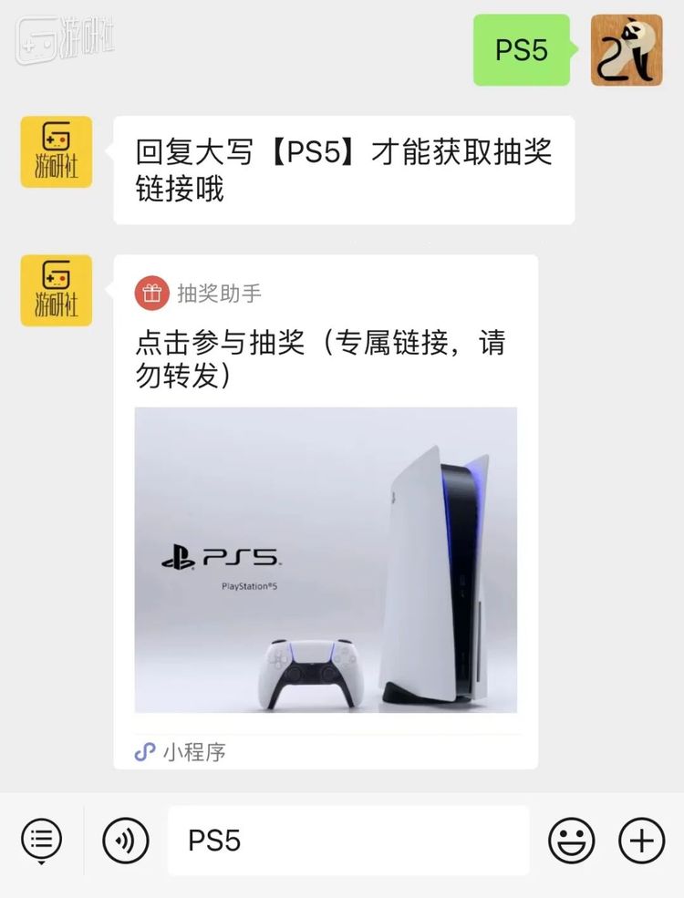今天正值除夕,游研社公众号给大家准备了一台PS5,在我们公众号后台对话框回复 大写 的【 PS5 】(如下图所示),即可获取抽奖链接。