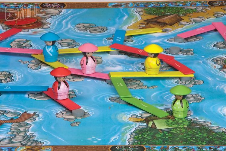 最后一款是《过江龙》,依旧秉承为春节聚会挑选桌游的准则——简单而有趣。本游戏支持2-6人参与,玩家扮演一位试图渡过江水抵达对岸的村民,需要在游戏中安放石墩和搭建木桥,同时阻挠对手,让自己第一个成功渡江。游戏内容物除了这个画出了江面的纸板之外,还有一些棋子、小木片和简单的卡牌,玩起来好上手且 看起来很讨喜 ,十分适合亲友聚会游玩。