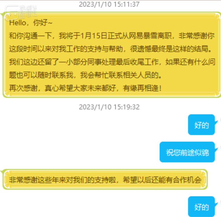 琉璃还分享了一张聊天截图,记录着网易的一位工作人员同他的告别。