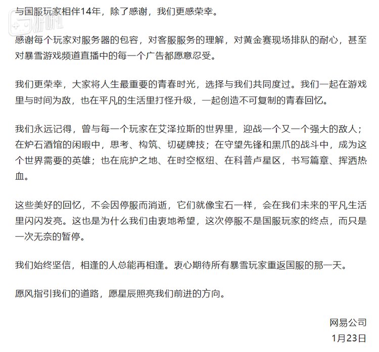 现在,暴雪已经关闭了国区战网客户端功能以及所有游戏服务器。网易官方也在23日下午发布了对暴雪国服玩家的告别信,感谢了国服玩家14年来的支持,“我们由衷地希望,这次停服不是国服玩家的终点”。