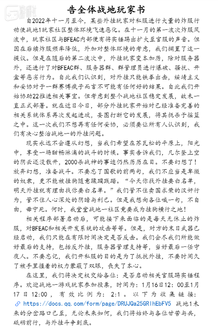 1月16日中午12点,BFEAC发布了《告战地全体玩家书》,呼吁绿色玩家“放弃幻想,准备战斗”;同时公布了一份需要输入EA帐户才能参与的民意投票调查问卷,将EAC接入官服的决定权下放给全体玩家和私服管理员。