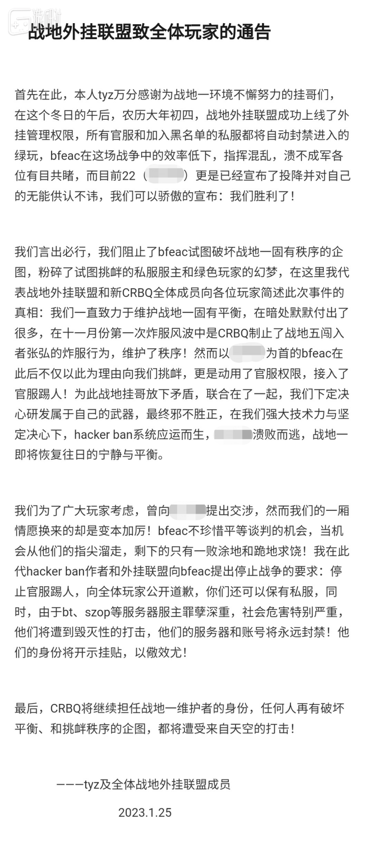 1月25日下午,CRBQ某成员发布了“战地外挂联盟致全体玩家的通告”,声称“成功上线了外挂管理权限”,“22宣布投降”,单方面宣布胜利;同时责令BFEAC“停止官服踢人,向全体玩家公开道歉”,这样“还可以保有私服”。
