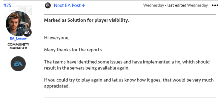 发现FF反作弊系统疑似抽风的现象之后,就有不少国内外玩家跑去EA的官方求助论坛反馈。不久,一位EA的社区经理给出回复,称问题已经上报给开发团队。到了美国人的上班时间,另一位社区经理表示,团队已经发布了一个临时修复补丁。