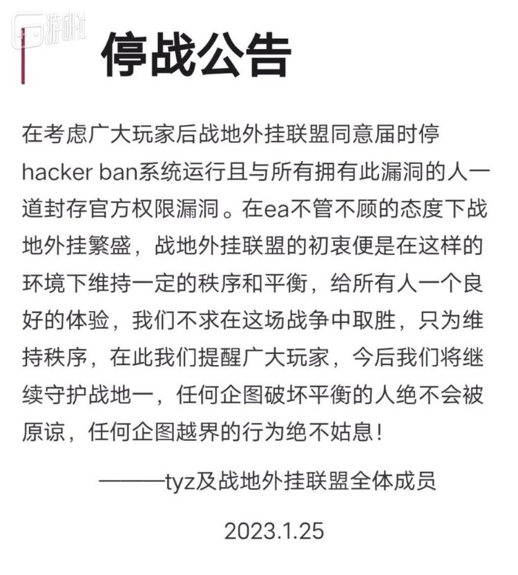 这两天,外挂团体依旧没有停止舆论攻势。EA社区经理回复后,他们发布了一则单方面的“停战公告”,称自己“考虑广大玩家”才停用权限,并“与所有拥有此漏洞的人一道封存官方权限漏洞”。