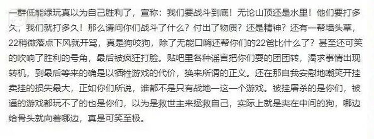 而另一边的外挂团体正相反,开战后就从未停下舆论攻势,如今则加速动摇了绿色玩家的信心。即便取得了技术优势,他们还在高调宣传外挂必胜的言论,大肆嘲讽绿玩的分裂现状——不如说,正是那些令任何一名绿色玩家都有可能感到生理不适的言辞,比“赛博一战”本身先火出了圈。