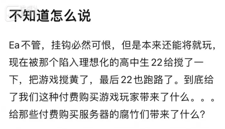 此前被主战派盖过风头的种种声音也大了起来:有人期冀于向外挂妥协,恢复曾经的官私平衡;有人批驳22的动机,怀疑他拿玩家当枪使;还有人抱怨BFEAC,而非外挂,毁掉了整个游戏……