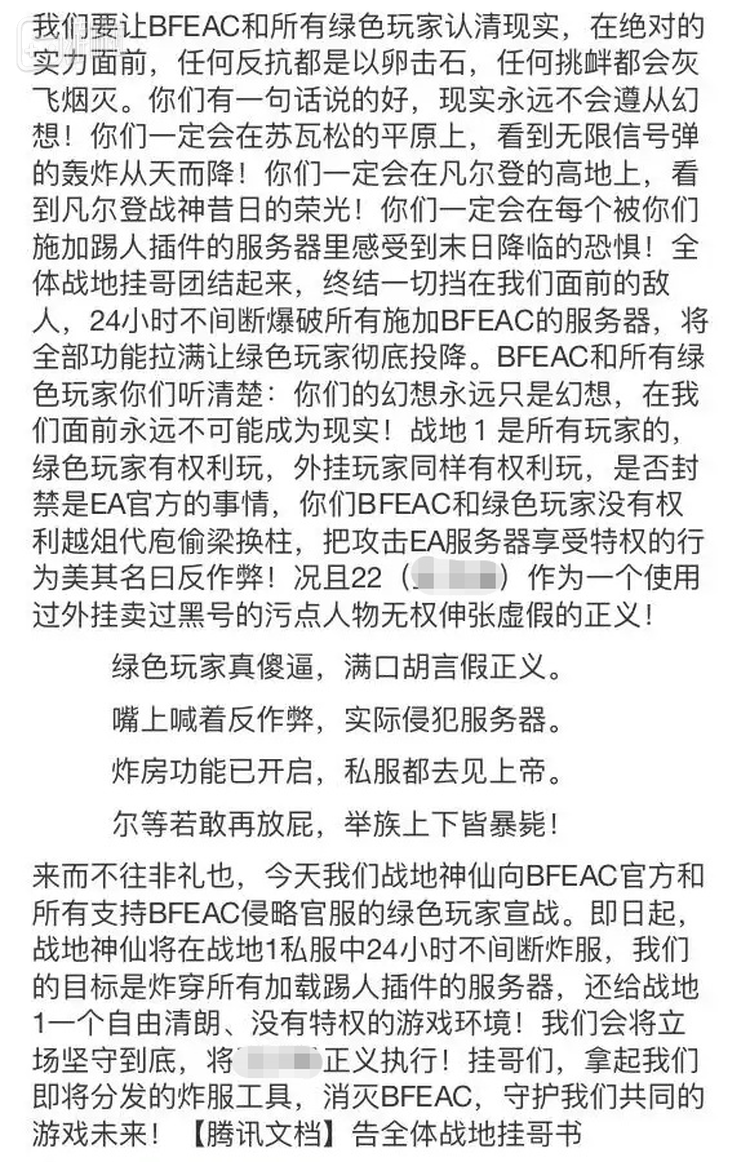 另一边,可能找到了其他外挂团体或个人开发者支援的CRBQ,也发布了一份“告全体战地挂哥书”,扬言“24小时不间断爆破所有施加BFEAC的服务器”、“让绿色玩家彻底投降”。