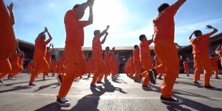 他们统一身穿橙色囚服,脸上洋溢着阳光的笑容,随着音乐跳起了略显可爱的宅舞。