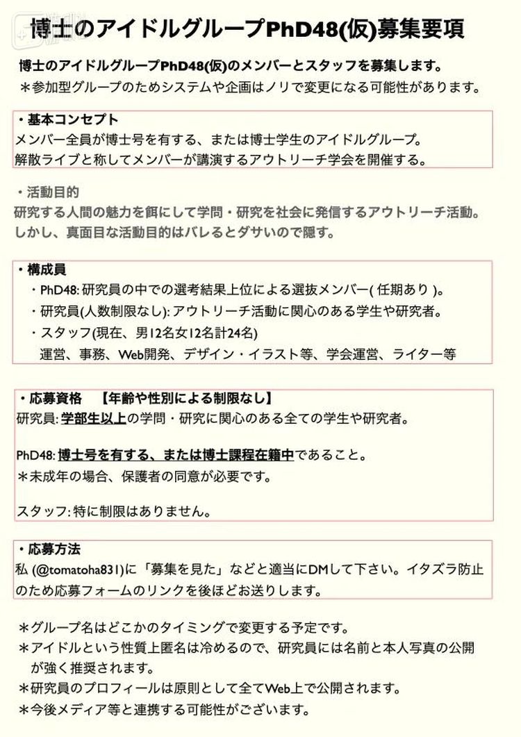 于「武田紘樹」所建立的PhD48官方账号上,他开始公开进行成员选拔。一些意图参与的博士们也在网络上踊跃为自己拉票: