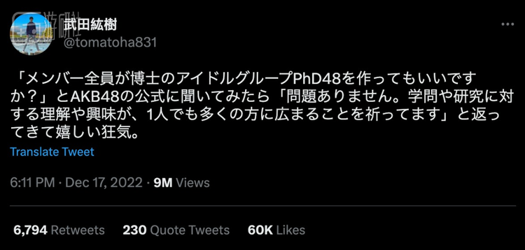 「武田紘樹」:想成立个全员博士生的偶像团体PhD48。